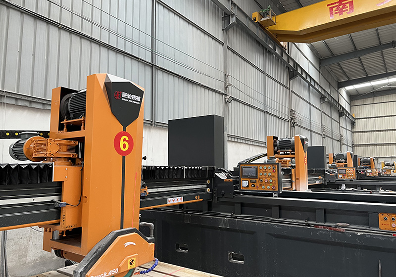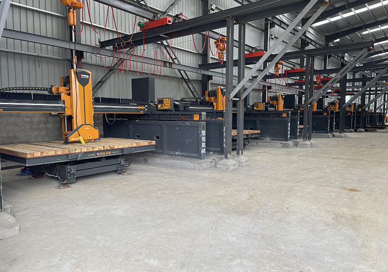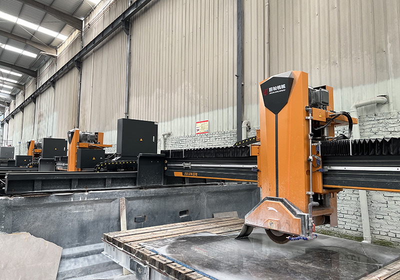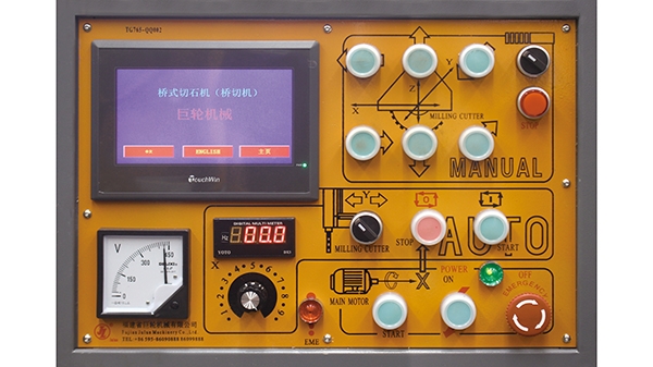 該機采用 PLC 可編程系統(tǒng)和人機操作界面,輔以高精度旋轉(zhuǎn)編碼器定位及紅外標(biāo)線儀。左右走刀采用變頻器控制,加上結(jié)構(gòu)優(yōu)化升級,左右走刀速度可大大提升,提高產(chǎn)能;上下升降采用液壓升降,結(jié)合厚鍍鉻導(dǎo)柱+耐磨導(dǎo)套,配合間隙小,耐磨精準(zhǔn);主軸箱配套優(yōu)化升級,可兼容高轉(zhuǎn)速;關(guān)鍵部位均采用進口零配件,因而具有切割效率高、切割精度高、穩(wěn)定性高、操作簡便等優(yōu)點,特別適用于花崗巖、大理石、巖板等板材的切割。